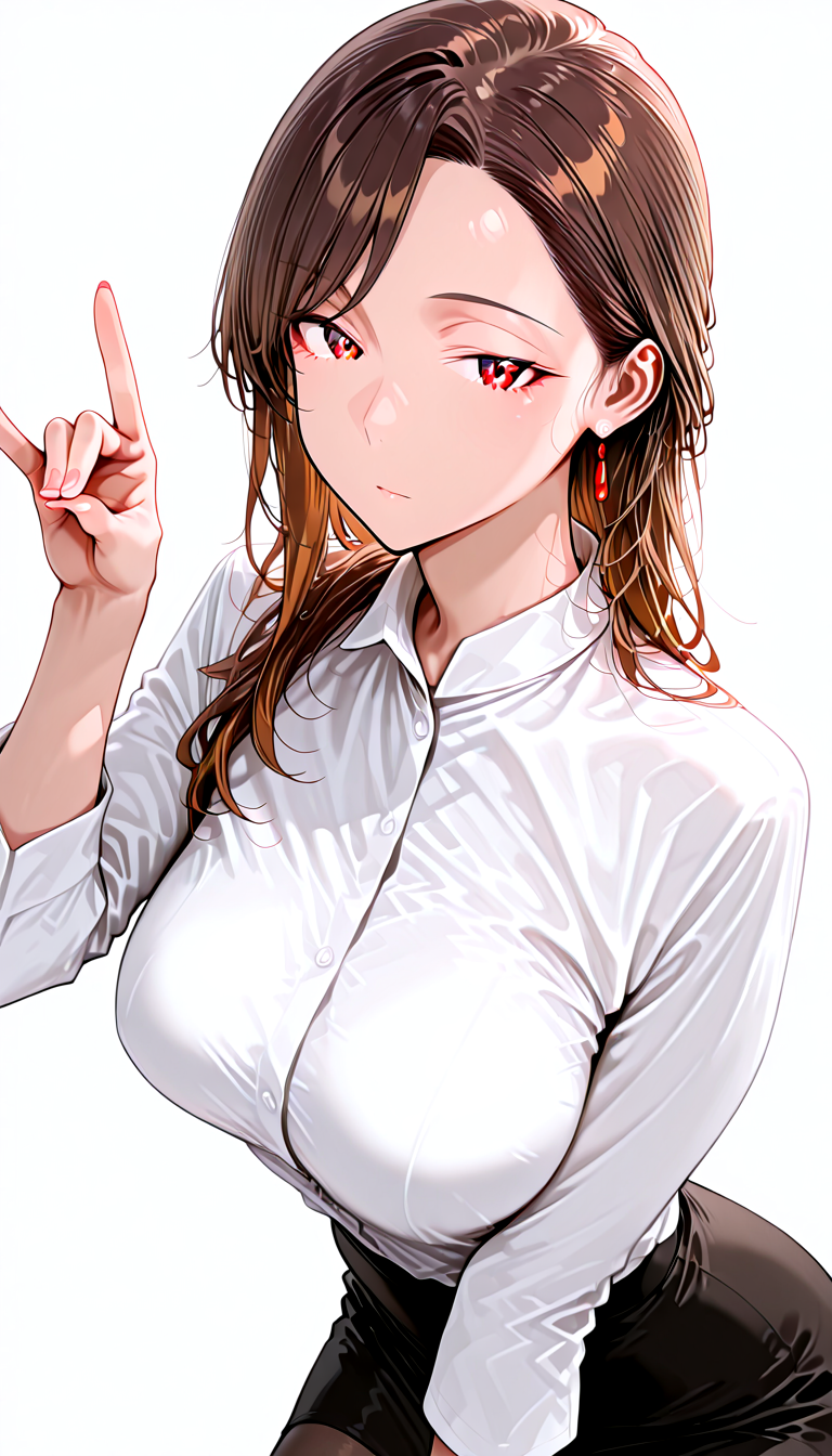 사무복 2: 흰 셔츠, 밝은 갈색 미니 연필 스커트, 검은 팬티스타킹
