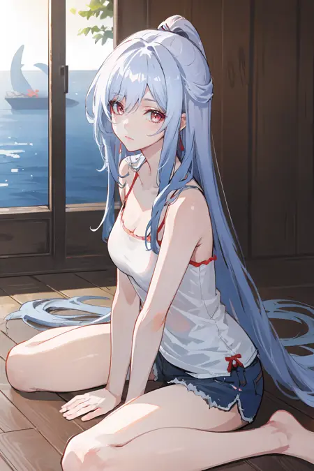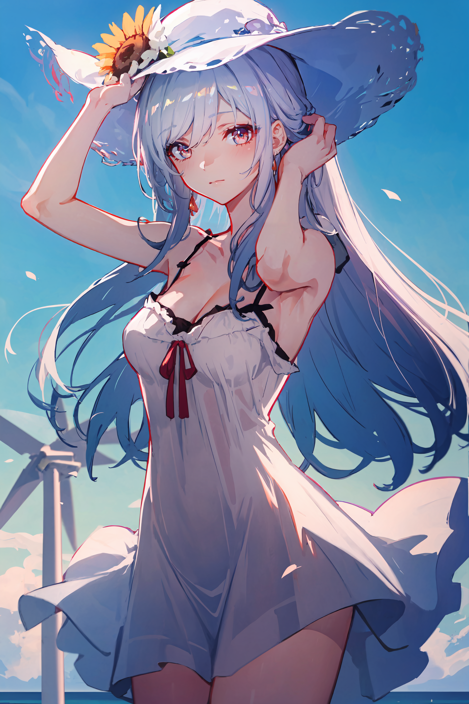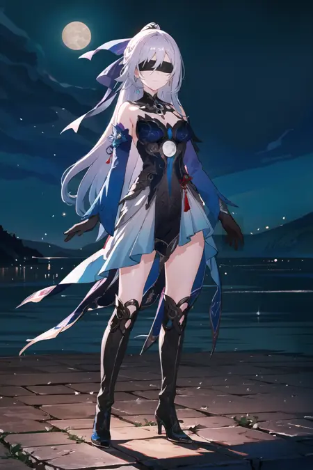 For V2, additional prompts for default costume: blue dress, detached sleeves, white skirt, pelvic curtain, halterneck, earrings, jewelry, black gloves, knee boots