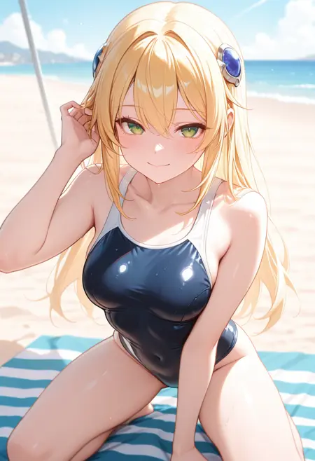 "NLLBLZB, 금발, 긴 머리, 머리 장식, 녹색 눈, 칼라가 있는 캐플릿, 빨간 넥타이, 흰 셔츠, 허리 부분, 파란 주름 치마, 검정 허벅지 긴 양말, 흰 장갑"