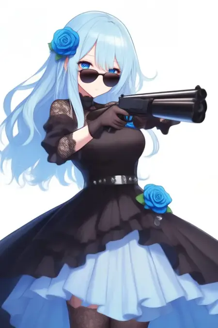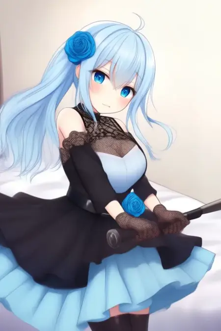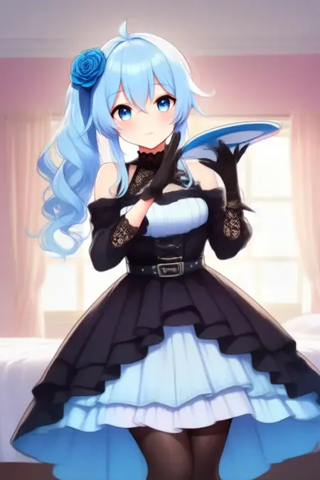 Trigger Word:Yukishiro Mahiro, anime-style girl. The image features a character with long, flowing light blue hair that cascades down to the shoulders. The hair is styled in loose waves, giving it a soft and elegant appearance. There are two blue roses attached to the hair, one on each side, adding a touch of color and detail.The character has striking blue eyes that stand out prominently against their pale skin. The eyes are large and expressive, contributing to the overall charm of the character.The character is wearing a black dress with intricate lace detailing on the shoulders. The top part of the outfit has a lace-up design, revealing a hint of skin. The sleeves are thin and fitted, complementing the overall aesthetic. The bottom part of the outfit appears to be a skirt or dress, with a ruffled hemline that adds a touch of elegance. She also wears a black belt with silver buckles around her waist, which complements her overall look.Her lower outfit consists of a light blue, puffy skirt that reaches just above her knees. The skirt is layered with multiple layers of fabric, creating a voluminous effect. The character is wearing black gloves that have a decorative pattern
