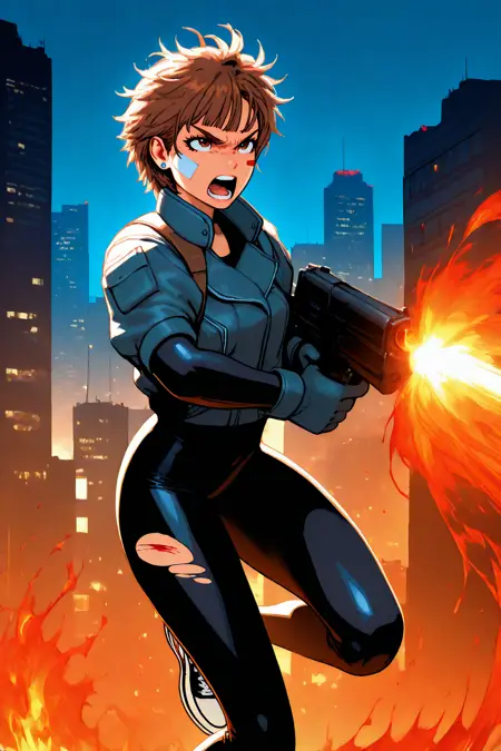 触发词:keisakuragi、深色皮肤女性、短发、棕色头发、刘海、棕色眼睛、耳钉、夹克、紧身衣、肩部枪套、手套、运动鞋、脸颊上有创可贴