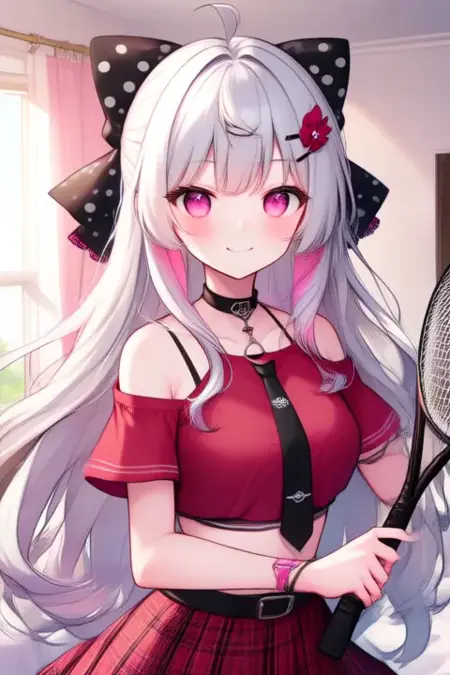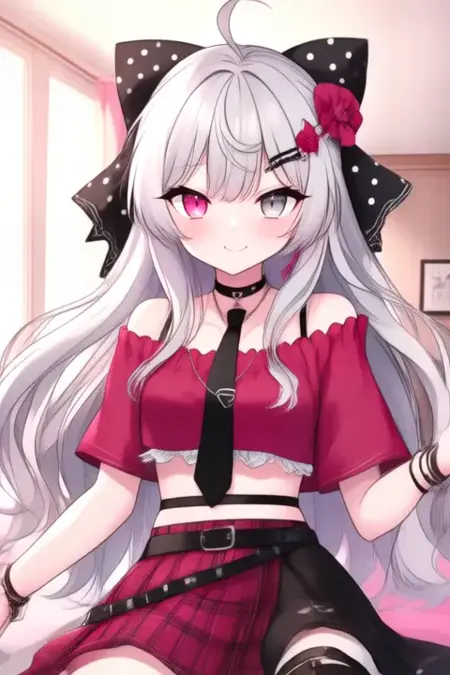 トリガーワード:Ishigami Nozomi、アニメスタイルの少女。画像は、肩まで垂れ下がる長い流れのような白髪のアニメスタイルのキャラクターを特徴としています。髪はゆるやかなウェーブでスタイリングされ、柔らかく流れるような外観を生み出しています。キャラクターの目は大きく、表現力豊かで、片方の目はピンク、もう片方の目はグレーであり、全体の印象に鮮やかさを加えています。キャラクターは黒いポカドット柄のリボンと赤い花のアクセサリーを身に着けています。衣装は、黒いネクタイと黒いベルトをアクセントとする赤いクロップドトップスで、胸元には小さなハート型のボタンが施された独自のデザインです。また、チェック模様の黒いスカートと黒い太ももまでのブーツを履いており、首にはチョーカー、手首にはブレスレットを着け、キャラクターのスタイリッシュな外見をさらに引き立てています。