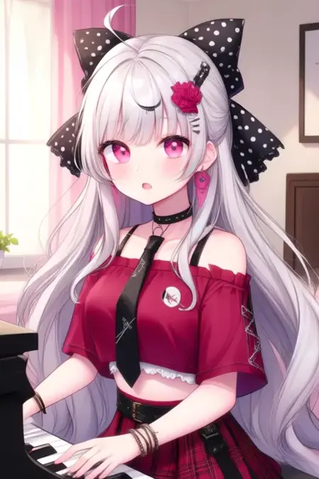 サンプルプロンプト:Ishigami Nozomi、アニメスタイルの少女。画像は、肩まで垂れ下がる長い流れのような白髪のアニメスタイルのキャラクターを特徴としています。髪はゆるやかなウェーブでスタイリングされ、柔らかく流れるような外観を生み出しています。キャラクターの目は大きく、表現力豊かで、片方の目はピンク、もう片方の目はグレーであり、全体の印象に鮮やかさを加えています。キャラクターは黒いポカドット柄のリボンと赤い花のアクセサリーを身に着けています。衣装は、黒いネクタイと黒いベルトをアクセントとする赤いクロップドトップスで、胸元には小さなハート型のボタンが施された独自のデザインです。また、チェック模様の黒いスカートと黒い太ももまでのブーツを履いており、首にはチョーカー、手首にはブレスレットを着け、キャラクターのスタイリッシュな外見をさらに引き立てています。(she is dancing:2.5), (chibi Nendoroid:3.5) in bedroom.