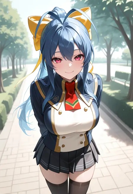 "NTSMABB, long hair, antenna hair, blue hair, yellow bow, ponytail, blazer, school uniform, black pleated skirt, thighhigh"