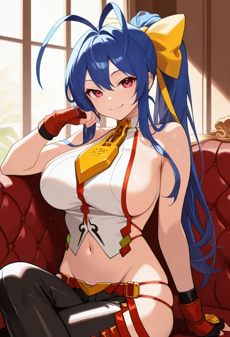 "NTSMABB, long hair, antenna hair, blue hair, yellow bow, white sleeveless top, navel, ponytail, red fingerless gloves, large breasts, sideboob, lowleg pants"
