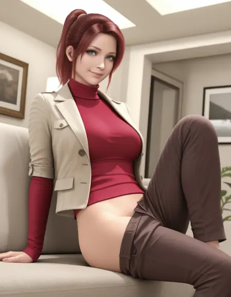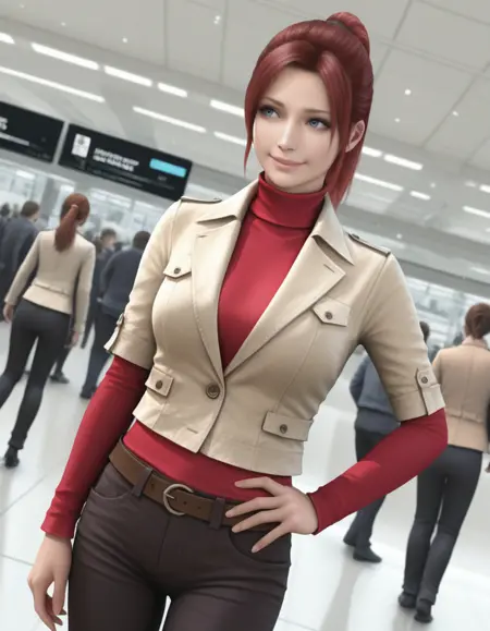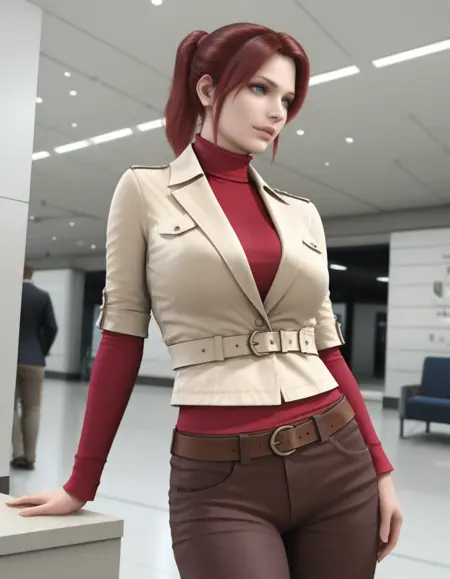 긍정적 프롬프트: 1girl, REClaire, 포니테일, 빨간 머리, 갈색 머리, 파란 눈, 가슴, 빨간 터틀넥, 베이지색 자켓, 긴 빨간 소매, 어두운 바지, 벨트