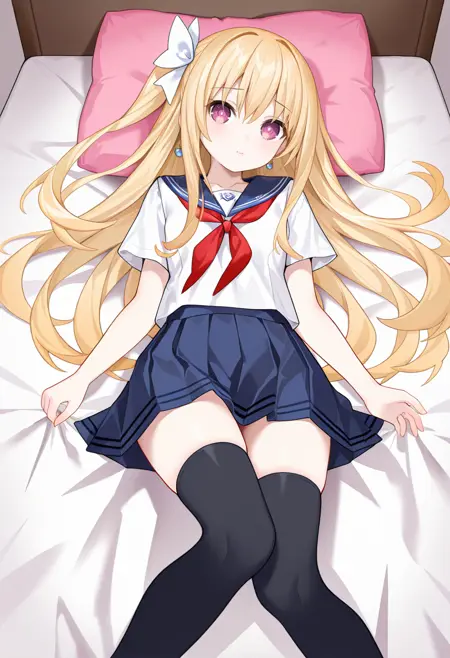 hair ornament,bangs,school uniform,sailor collar,serafuku,collarbone,blue serafuku,white sailor collar,long sleeves,neckerchief,shirt,skirt,