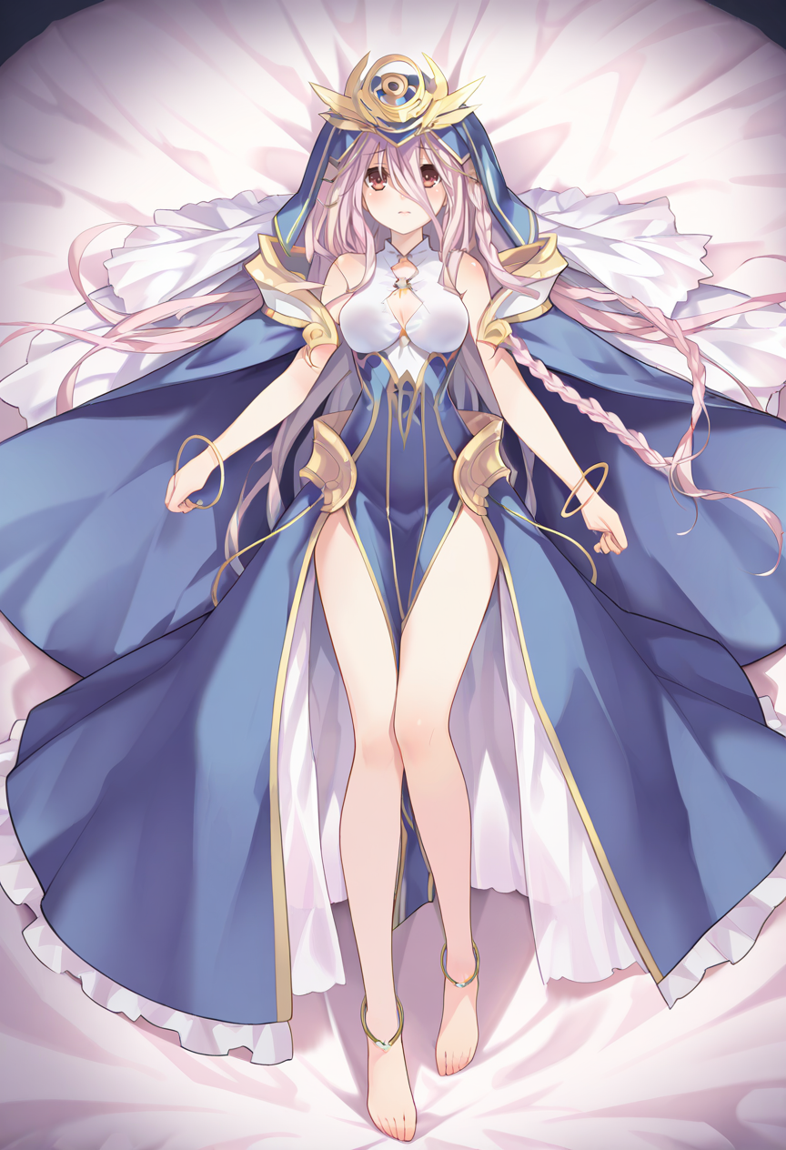 spiritual outfit,very long hair,bangs,twin braids,hair between eyes,hair flower,white flower,braid,bare shoulders,collarbone,white long dress,barefoot,