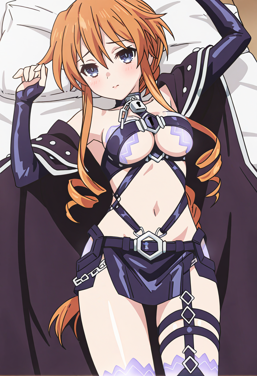 spiritual outfit,long hair,orange hair,blue eyes,hair between eyes,braid,chain,bondage outfit,collar,cuffs,navel,black skirt,miniskirt,garter straps,thighhighs,thigh boots,boots,