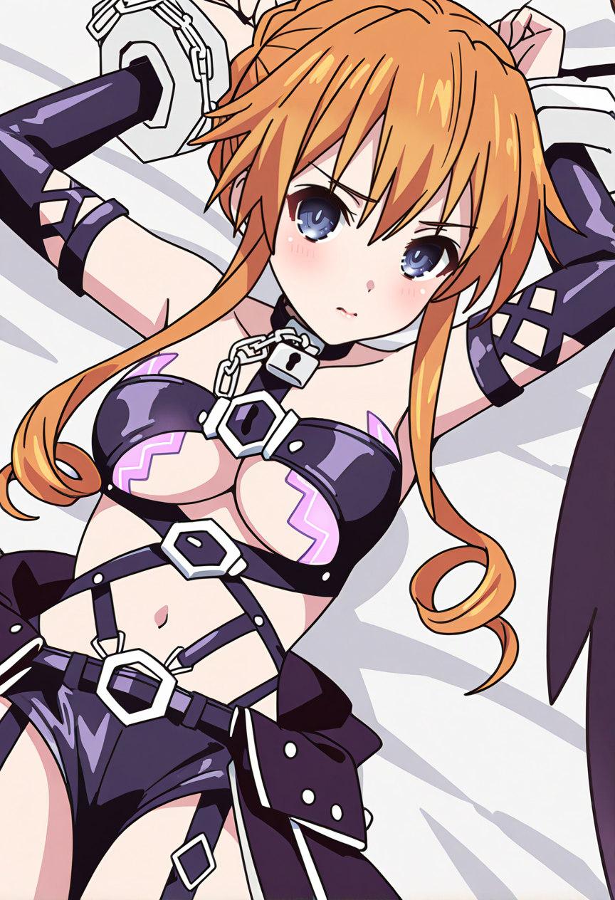 spiritual outfit,orange hair,drill hair,long hair,blue eyes,collar,bondage outfit,bare shoulders,thighhighs,navel,chain,midriff,elbow gloves,cuffs,short shorts,sidelocks,garter straps,high heels,thigh boots,boots,purple footwear,