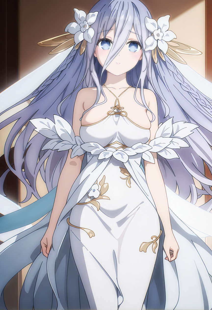 spiritual outfit,hair between eyes,side ponytail,dress,hair flower,white flower,hair ornament,jewelry,veil,bare shoulders,collarbone,white gloves,bracelet,white dress,side slit,high heels,