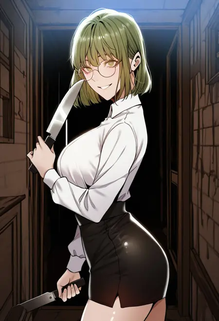 秀基:soo-ki,美丽的浅绿色眼睛,美丽的绿色头发,美丽的中等长度鲍伯头,刘海,丰满而蓬松的胸部,戴眼镜,