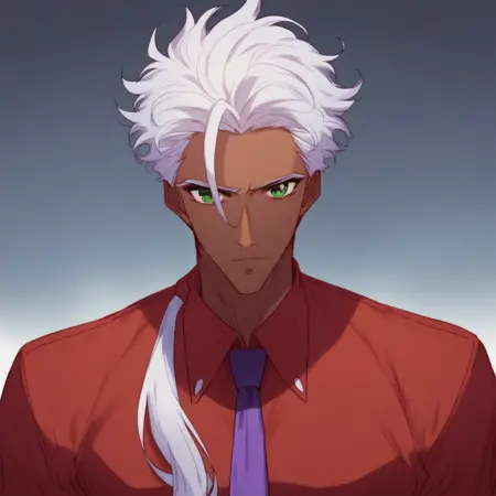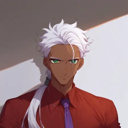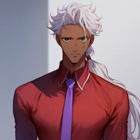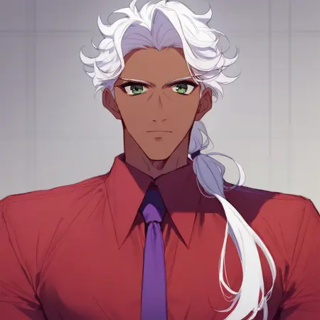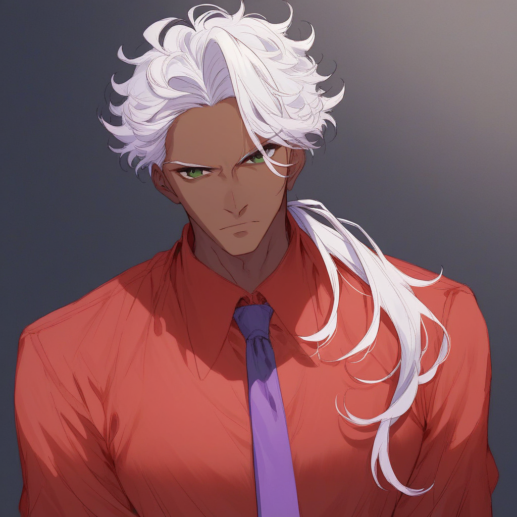 ut3n4-style, 1boy, solo, male focus, purple necktie, dark skin, dark-skinned male, ponytail, green eyes, long hair, upper body, looking at viewer, long sleeves, low ponytail, white hair, red long sleeve shirt, black pants, akio