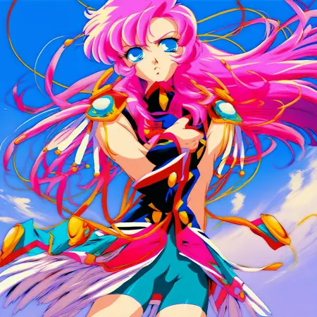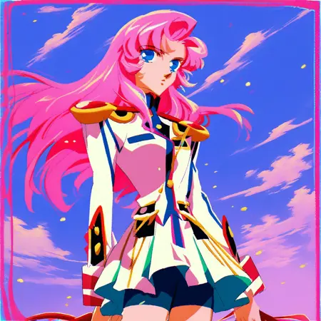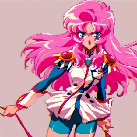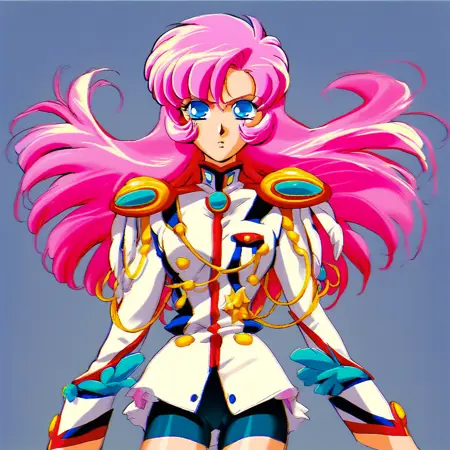 ut3n4-style, 1girl, solo, pink hair, long hair, epaulettes, 1990s (style), blue eyes, retro artstyle, aiguillette, bike shorts, utena
