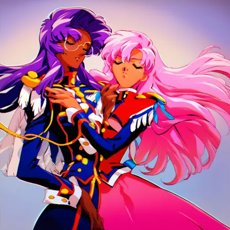 ut3n4-style, multiple girls, 2girls, 1990s (style), pink hair, retro artstyle, human scabbard, dark skin, long hair, closed eyes, dark-skinned female, aiguillette, epaulettes, purple hair, dress, glasses