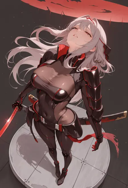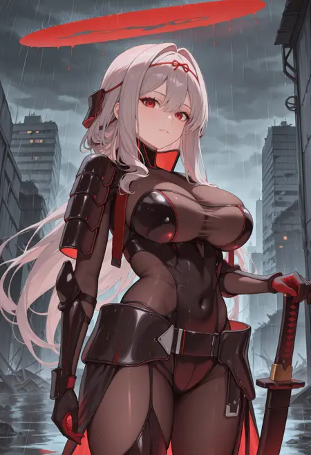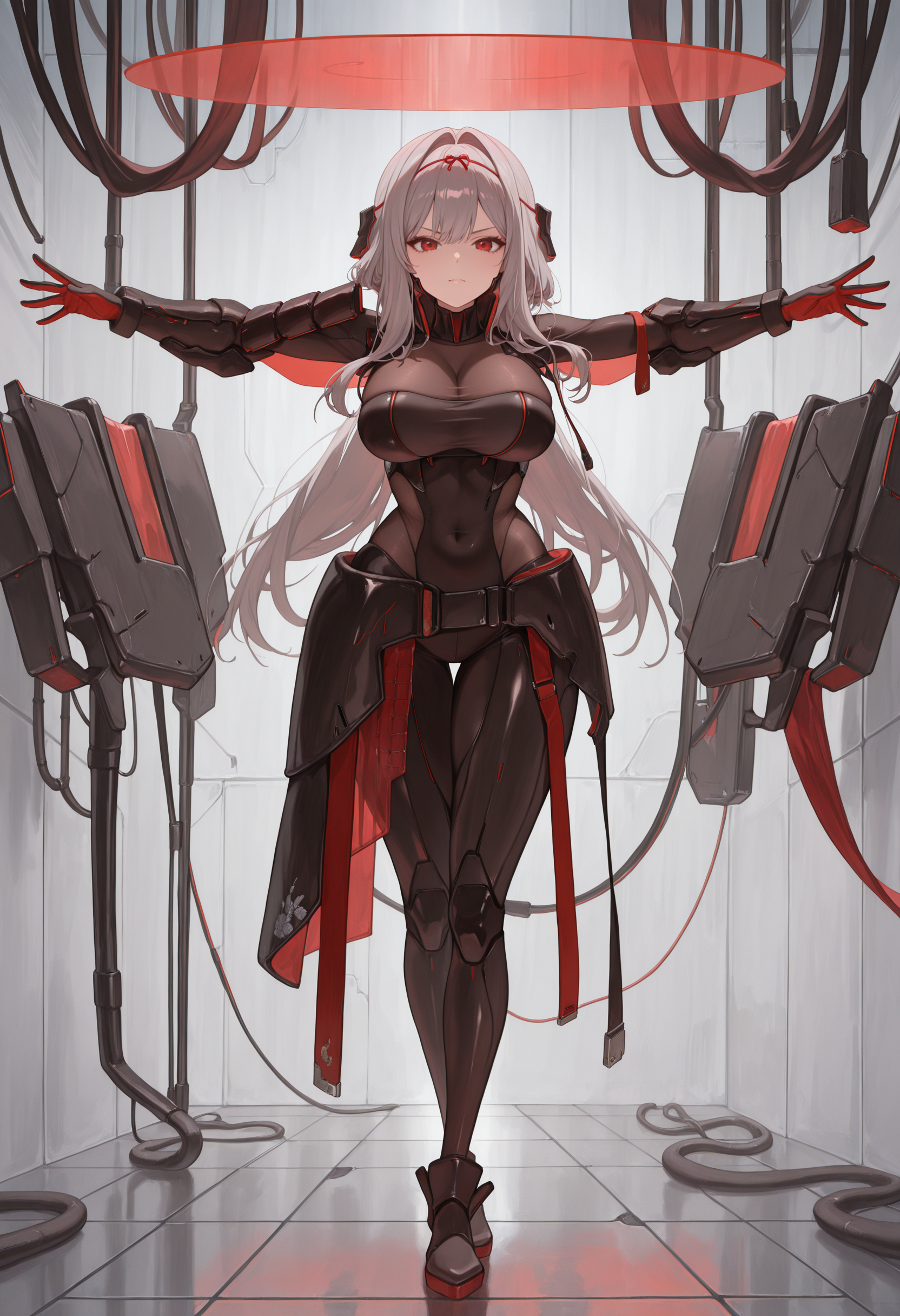 scrltbs,红眼睛,灰发,长发,头发遮住眼睛,鬓发,发带,红色发带,头饰,红色光晕,黑色紧身衣,全身连体衣,黑色盔甲,肩甲,袖甲,大乳房,透明乳沟,遮盖肚脐,黑色手套,红色手套,双色手套