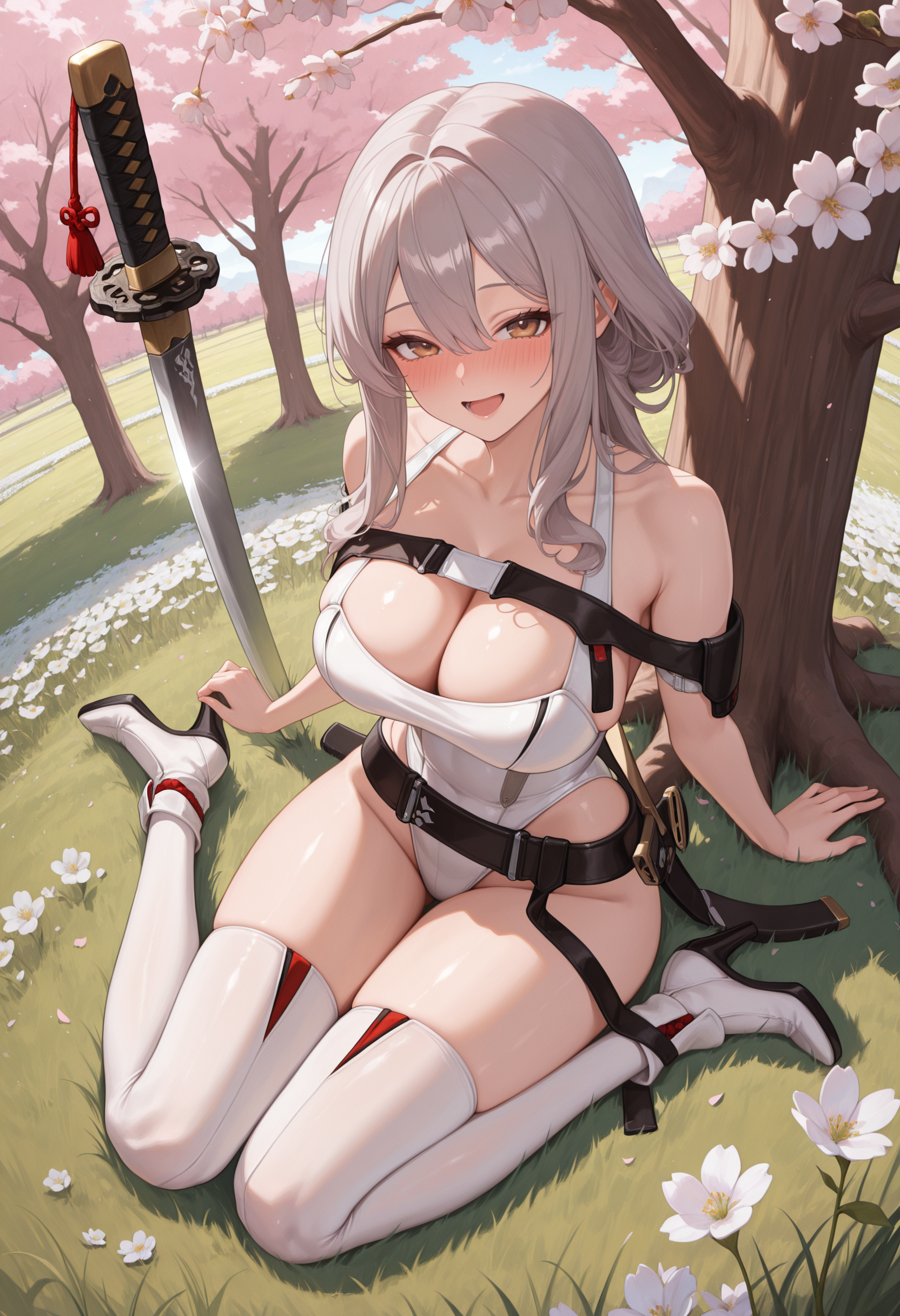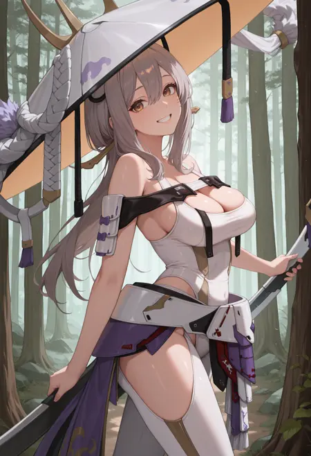 scrltdf,黄眼睛,棕眼睛,灰发,长发,头发在眼睛之间,鬓发,发饰,军帽,大帽子,帽饰,胸带,单肩护甲,裸露肩膀,白色紧身衣,乳沟,大乳房,白色盔甲,日本盔甲,护腹,白色腿部装具,髋部开孔,大腿镂空