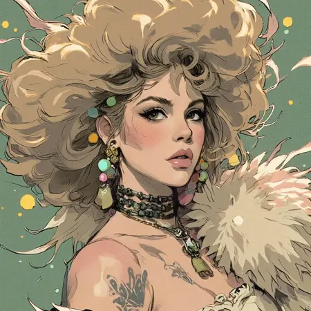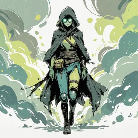 詳細な線画と表現的なコントラストを組み合わせた強いインク画風。カラーパレットは鮮やかで落ち着いたトーンを組み合わせ、現代的なファンタジーの雰囲気を生み出します。表現豊かなキャラクターやシーンの作成に最適です。