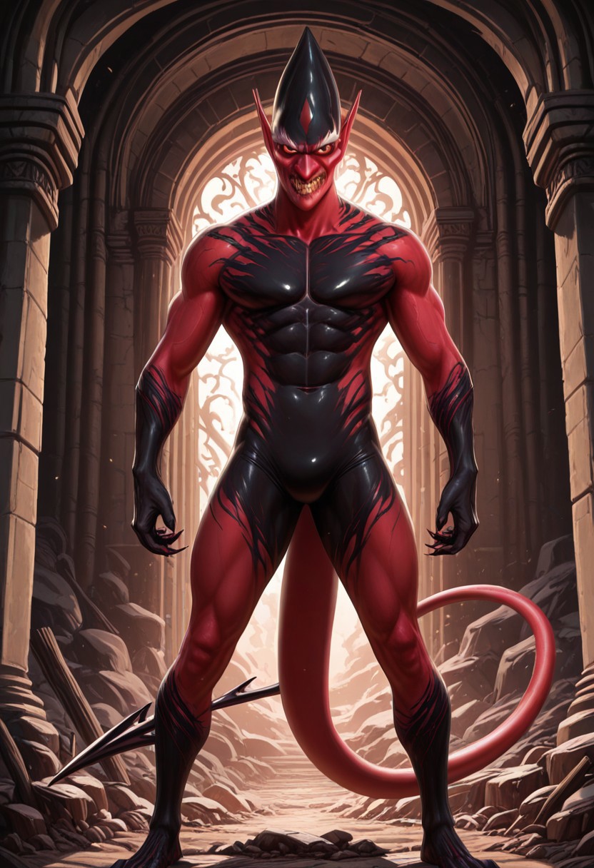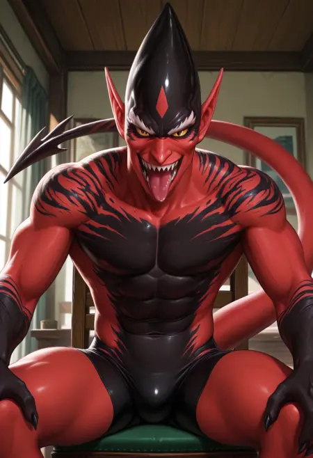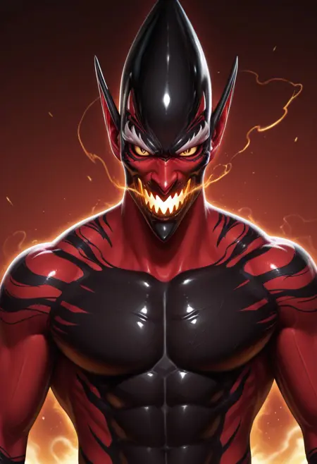 トリガー語: red_goblin, red_symbiote, 悪魔の尾, 大きな尾, 白い眉, 二色肌, 赤と黒の肌, 尖った頭, 尖った鼻, 大きな耳, 尖った歯, 光る口, 黄色い目