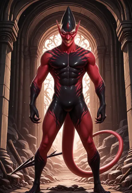 캐릭터를 더 잘 보이게 하는 추가 단어: 꼬리, 빛나는 입, 웃고 있는 표정, 흰색 눈썹, 검은 눈, 노란색 공막, 색상이 있는 공막, 색상이 있는 피부, 빨간 피부, 뾰족한 귀