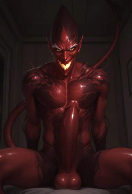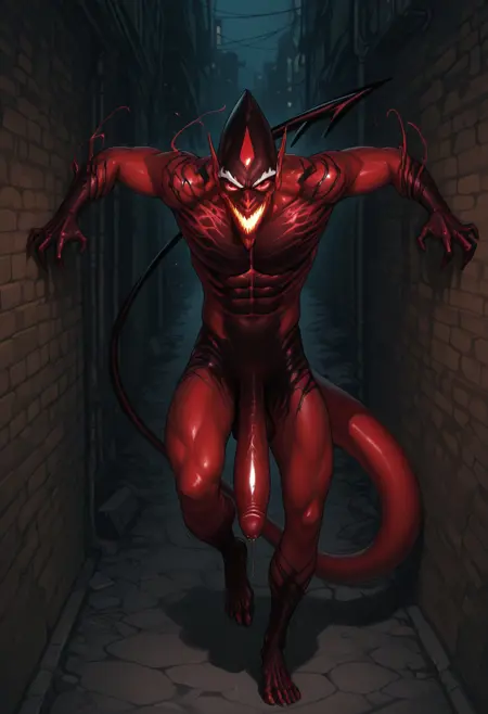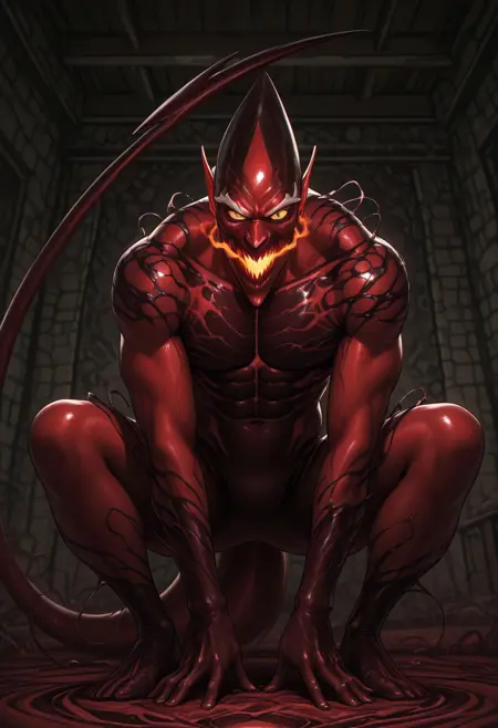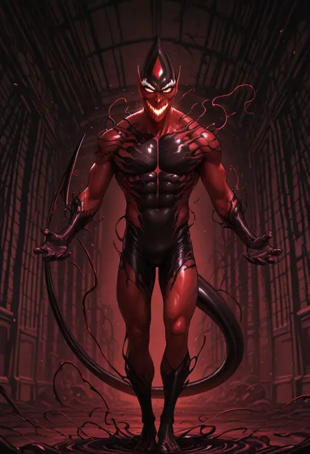 触发词:red_goblin, red_symbiote, 恶魔尾巴, 巨大尾巴, 白色眉毛, 双色皮肤, 红黑皮肤, 尖头, 尖鼻子, 大耳朵, 锋利牙齿, 发光的嘴, 黄色眼睛
