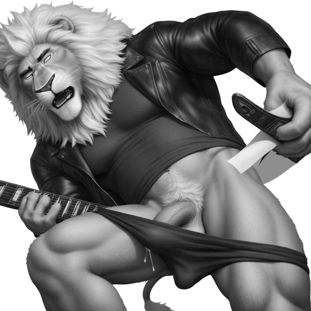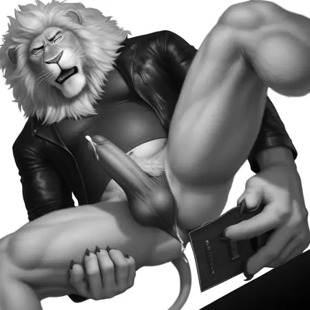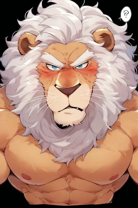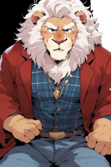 Clay Calloway, solo, male, furry, adult, elderly lion, blue eyes, white eyebrows, orange fur, white mane, thick red cloth coat, blue plaid shirt, blue jeans, brown shoes.