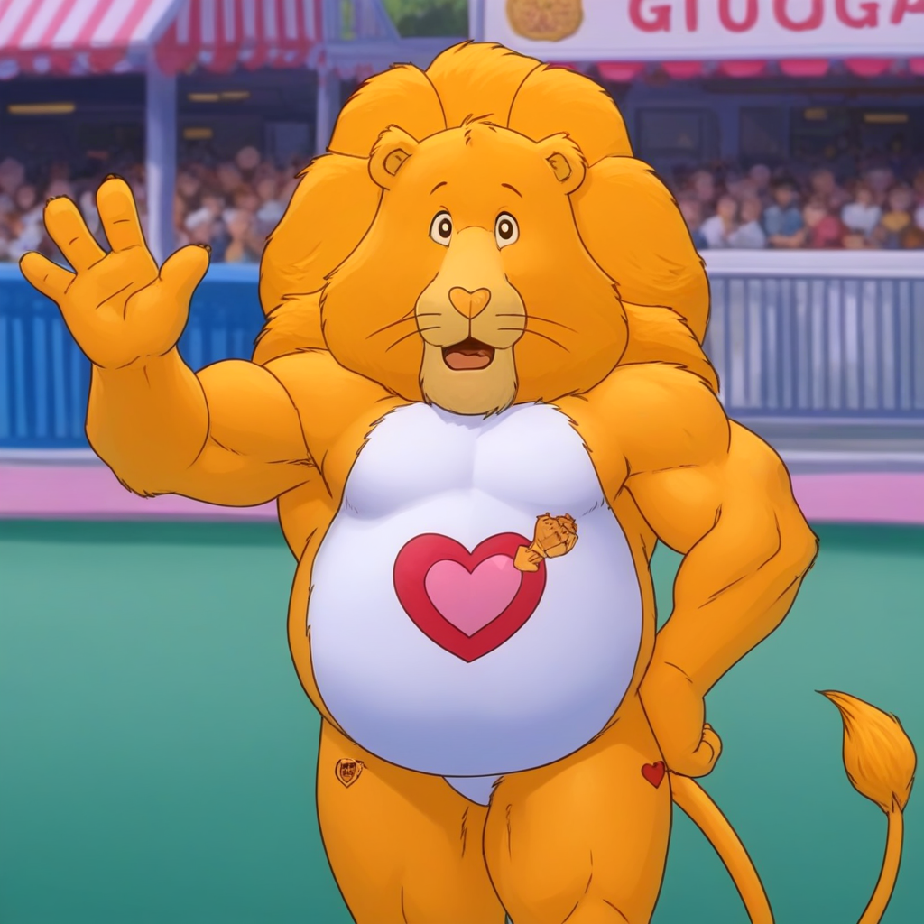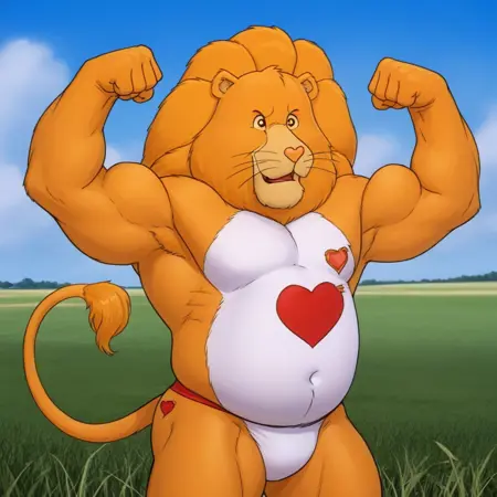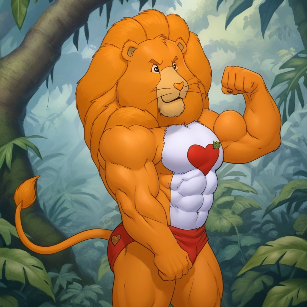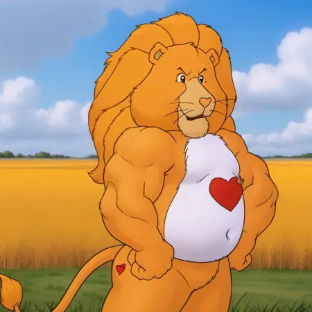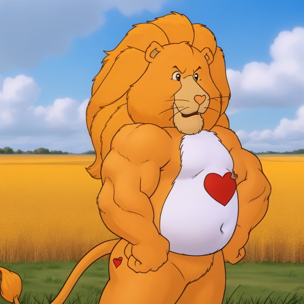 关键词:狮子、黄色身体、高大、肌肉发达、圆肚、鬃毛、尾巴、细致的眼睛、单人、心形鼻子。