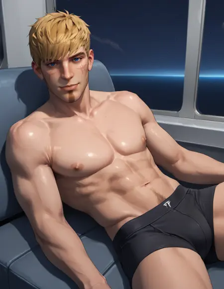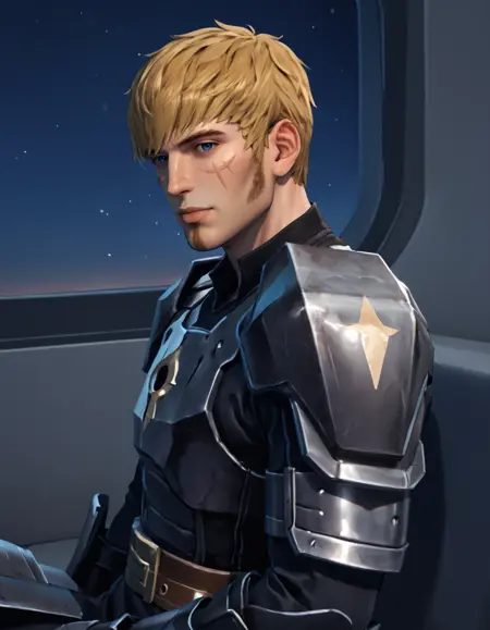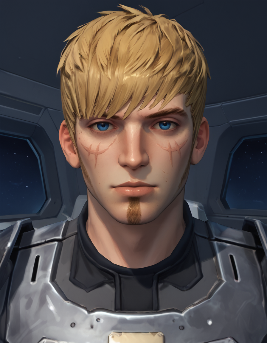 tcadera, 1boy, very short hair, sideburns, goatee, blue eyes, cheek scars