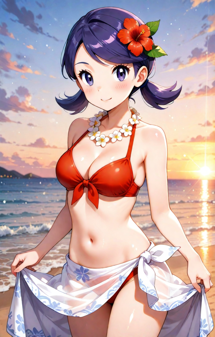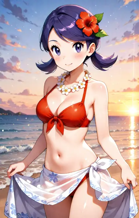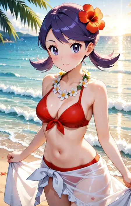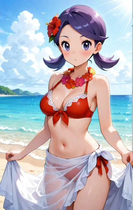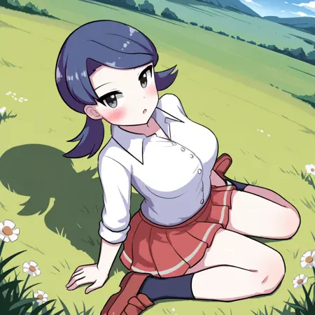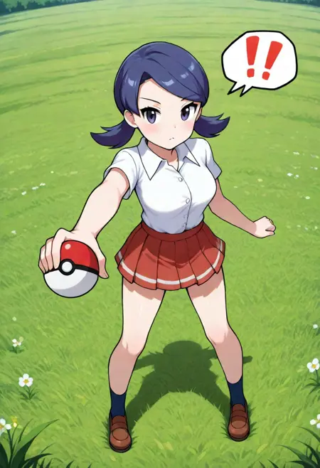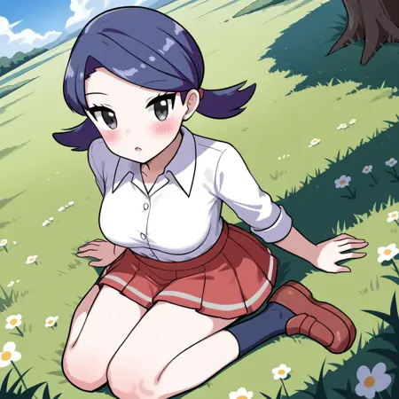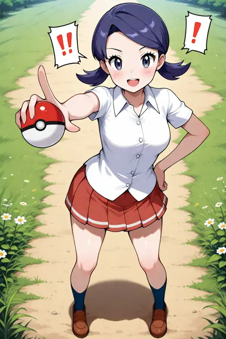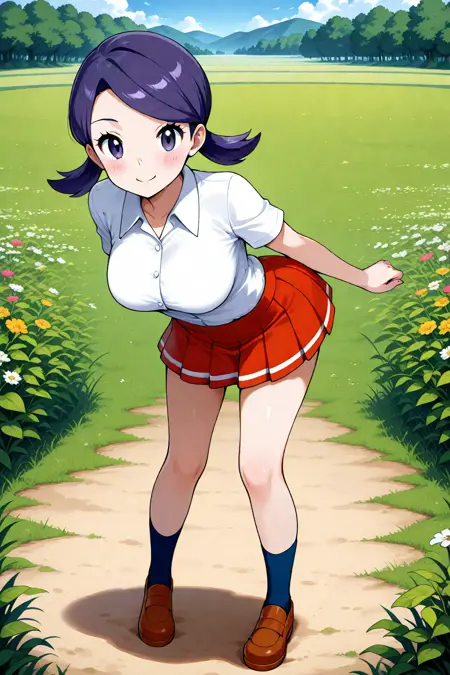 lassrse, lass \(pokemon rse\), purple eyes, purple hair, short hair, low twintails, white shirt, collared shirt, red skirt, pleated skirt, miniskirt, dark blue socks, shoes, brown footwear