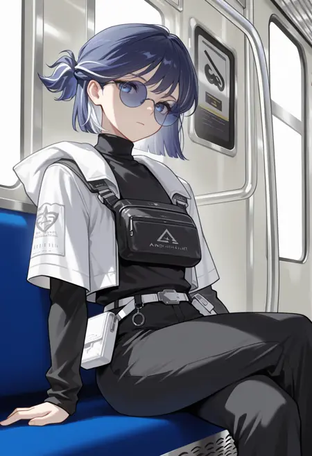 サイレントアロー: andr3anaslnt, 短い髪, ストライプ入り髪, 青い髪, 白い髪, 短いポニーテール, 青い目, 円形の眼鏡, 青みがかった眼鏡, ガラス眼鏡, 白いジャケット, フード付きジャケット, フードを下げた状態, 開いたジャケット, 重ねた袖, 短い袖が長い袖の上, 黒いセーター, チュルネックセーター, 黒いパンツ, 白いベルト, 黒いバッグ, ファニーパック