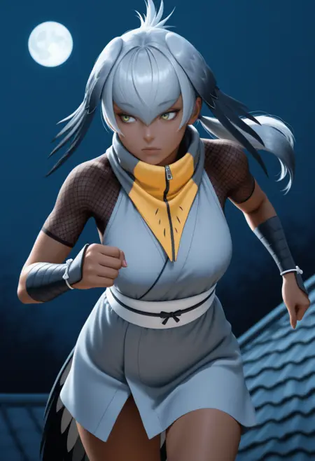 EX: sh0eb1llex, 深色皮肤女性, 鸟尾, 长发, 多彩发色, 灰色头发, 黑色头发, 侧发, 发丝遮眼, 低马尾, 头部翅膀, 鸟翼, 绿色眼睛, 日式服装, 短和服, 灰色和服, 无袖和服, 多彩围巾, 黄色围巾, 灰色围巾, 拉链拉环, 网眼上衣, 短袖, 手套, 白色腰带, 脚踝绑带