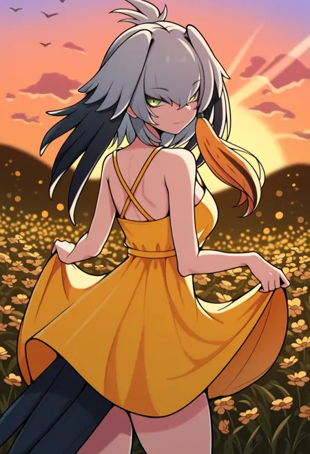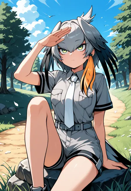 默认服装: sh0eb1lldef, 鸟尾, 长发, 多彩发色, 灰色头发, 黑色头发, 橙色头发, 侧发, 发丝遮眼, 头部翅膀, 鸟翼, 绿色眼睛, 灰色上衣, 有领衬衫, 翼领, 胸袋, 白色领带, 分层袖子, 短袖叠长袖, 灰色紧身衣, 黑色手套, 无指手套, 灰色短裤, 短裤, 灰色腰带, 灰色连裤袜