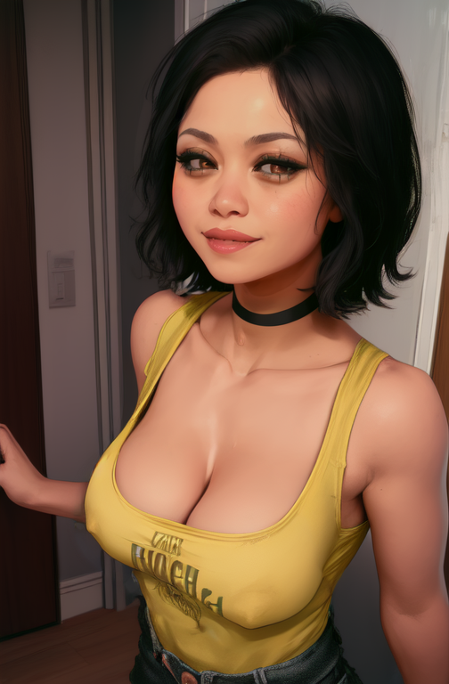 black jacket, yellow shirt, black jeans, black choker, belt, - heels or boots, toeless shoes,