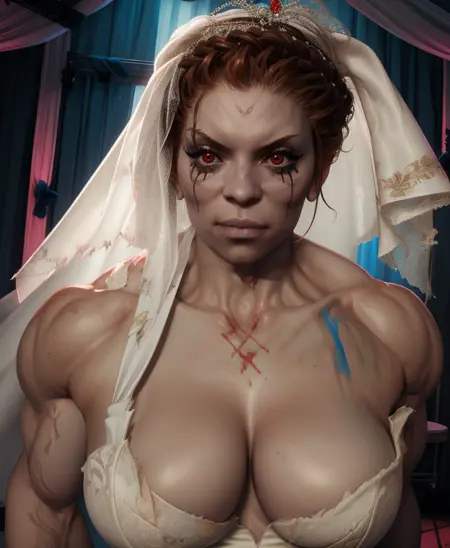 becki, red eyes, brown hair, - braid, or short hair, - muscular,