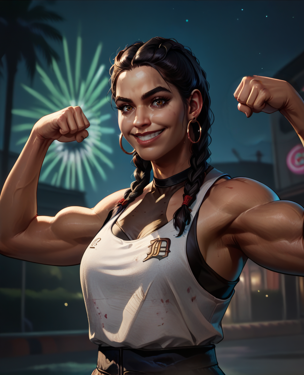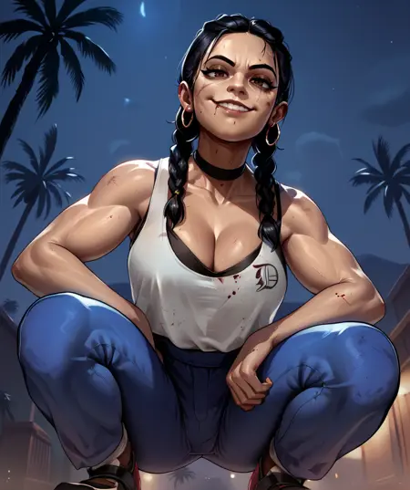 carla, 검은 머리, 갈색 눈, 쌍둥이 땋은 머리, 근육질