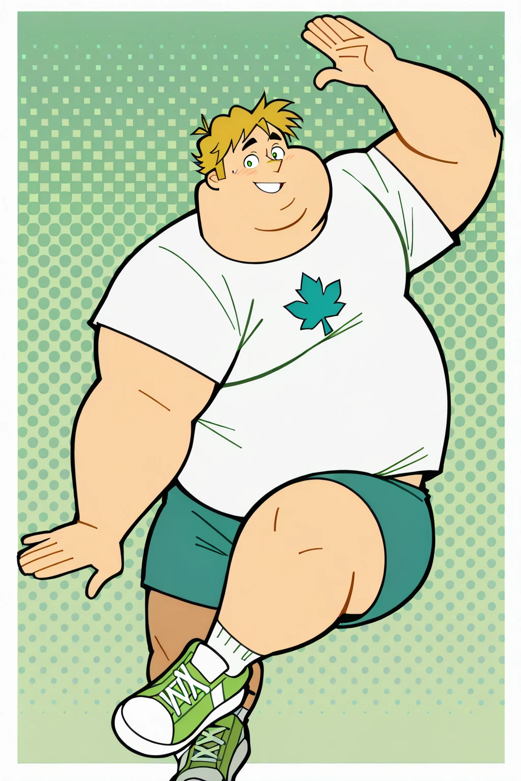 OwenTDI, 1boy, overweight, messy golden-blonde hair, dark green eyes, light skin, white shirt with teal maple leaf symbol, green shorts, white socks, green-white shoes, owen (tdi)