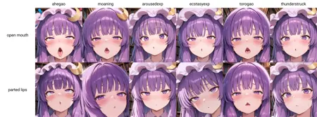욕설 표현 메가팩은 개별 LoRA 릴리즈 개념에 균등하게 분포된 정제된 데이터셋으로 구성됩니다. 이 방식의 장점은 단일 LoRA로 여러 표현의 트리거 단어를 조합하여 표현 유형을 자유롭게 혼합할 수 있다는 점입니다. 이는 파일 크기가 압축되어 디스크 공간을 절약할 수 있다는 추가 이점이 있습니다. 단점은 개념 간 혼합이 발생한다는 점입니다. V3에는 많은 개념이 포함되어 있어 특정 개념 간 혼합이 더 두드러집니다. 쇼케이스 샘플의 XYZ 플롯 이미지는 어떤 표현들이 겹치는지 좋은 지표를 제공합니다. 부정 프롬프트를 사용하거나 긍정 프롬프트를 신중하게 구성하여 이러한 겹침을 줄일 수 있습니다.