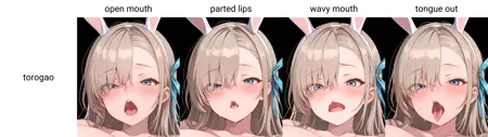 主要なトリガー語は「pleasureface」です。異なる表情には「vertmouth」「ahegao」「moaning」を組み合わせて使用してください。