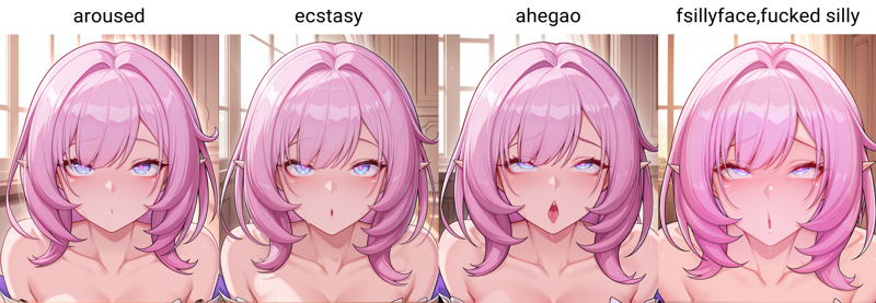 주요 트리거 단어는 “pleasureface”입니다. 다양한 표현을 위해 “vertmouth”, “ahegao”, “moaning”을 조합하여 사용하세요.