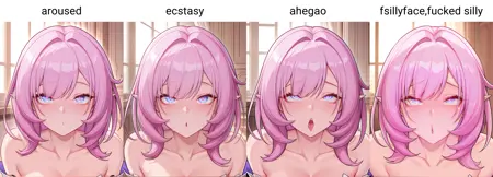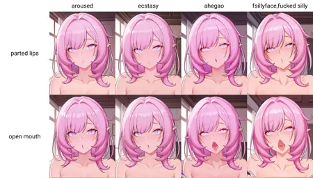The main trigger word is pleasureface. Use vertmouth, ahegao, and moaning in various combinations for different expressions.