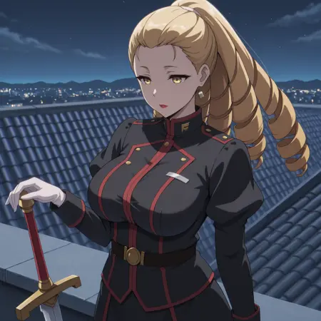 yellow eyes, blonde hair, drill hair, hair pulled back, ponytail, long hair, lipstick,