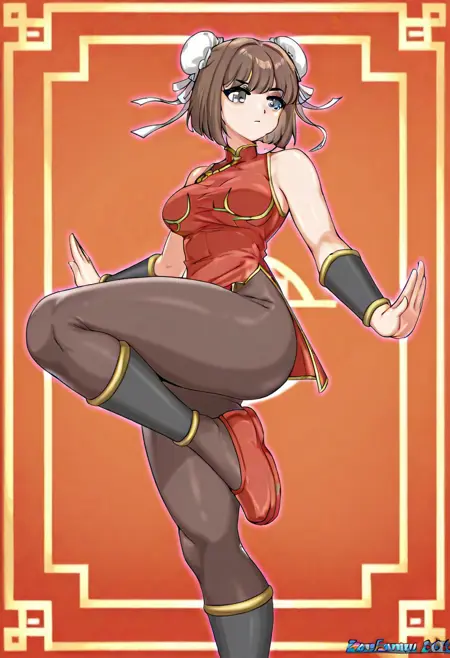 1girl, solo, pantyhose, double bun, bun cover, hair bun, brown hair, bangs, chinese clothes, dress, china dress, red dress, qipao, short hair, sleeveless, bare shoulders, black pantyhose, thighs, grey eyes, bracers, shin guards, kung fu shoes,