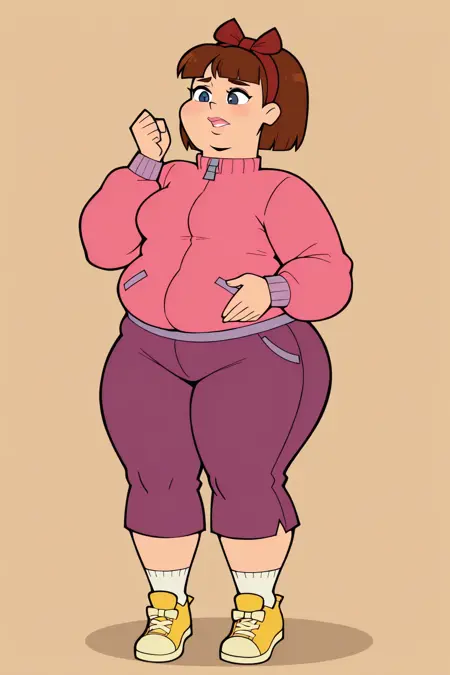 StaciTDROTI, 1girl, brown hair, dark blue eyes, dark red headband, dark red head bow, light pink lips, lipstick, pink vest, pink jacket, light purple pants, cream colored socks, yellow shoes, cream colored soles, fat, chubby, staci (tdi),