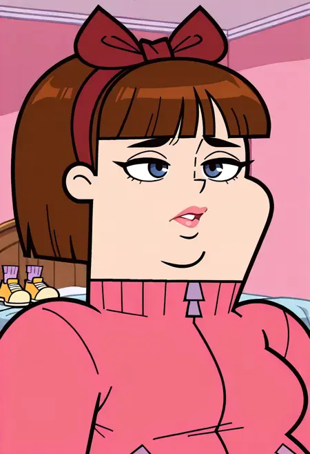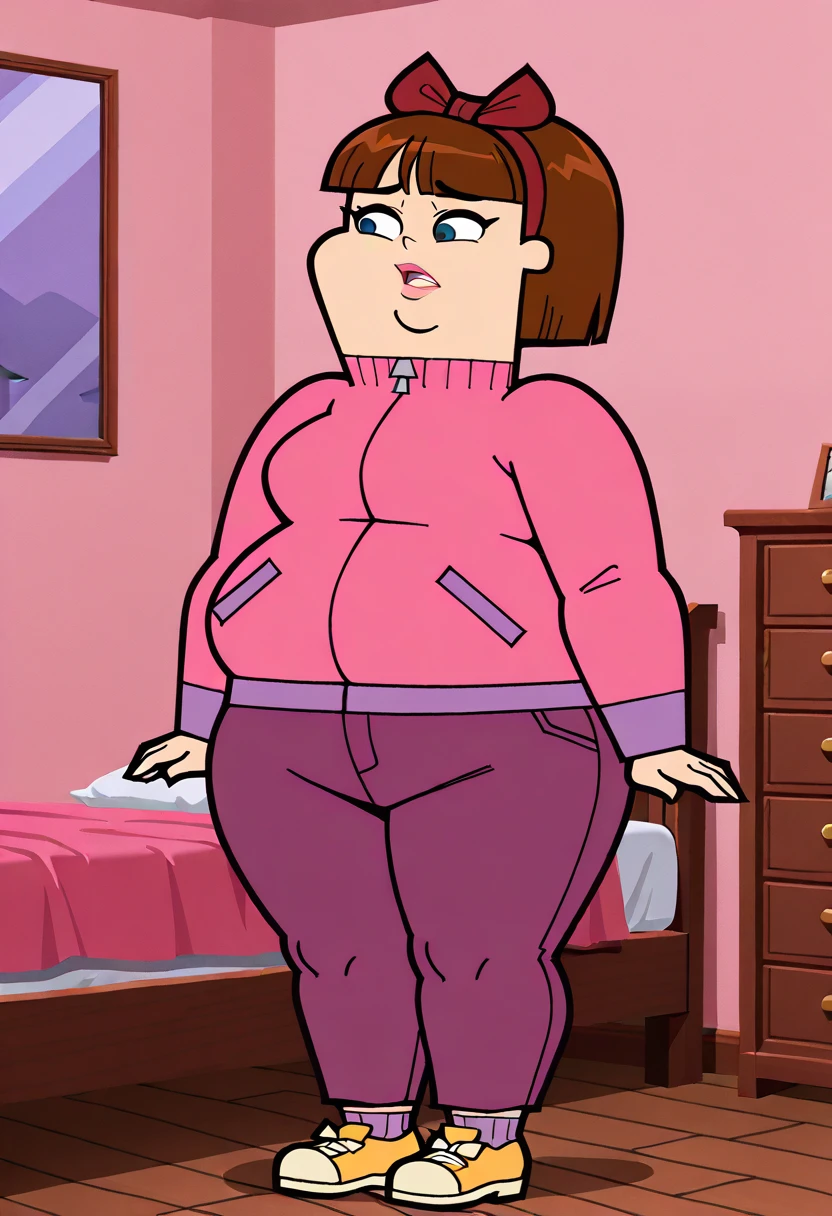 StaciTDROTI, 1girl, brown hair, dark blue eyes, dark red headband, dark red head bow, light pink lips, lipstick, pink vest, pink jacket, light purple pants, cream colored socks, yellow shoes, cream colored soles, fat, chubby