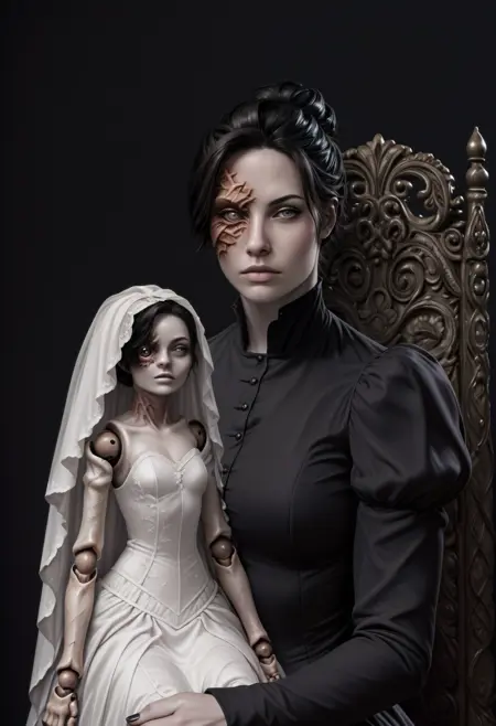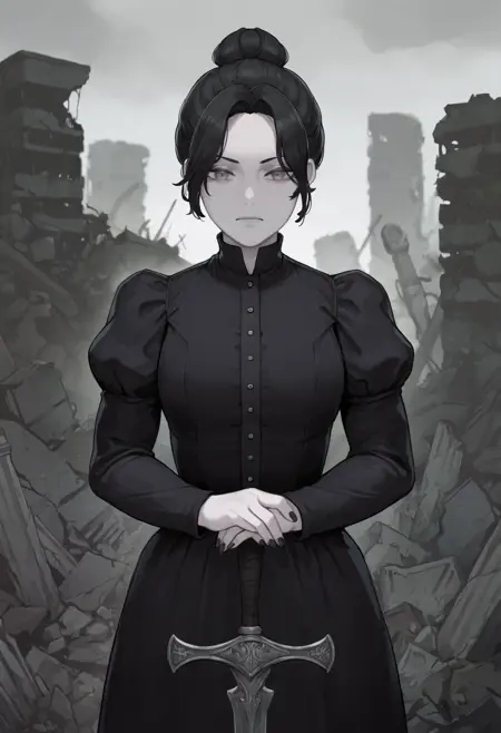 衣装タグ: 高めの襟、黒いドレス、ボタン、長袖、ジュリエット袖