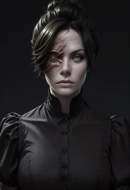 外見タグ: 薄い肌、黒髪、一つ結び、灰色の目、目元に傷、片目を覆う、黒い爪