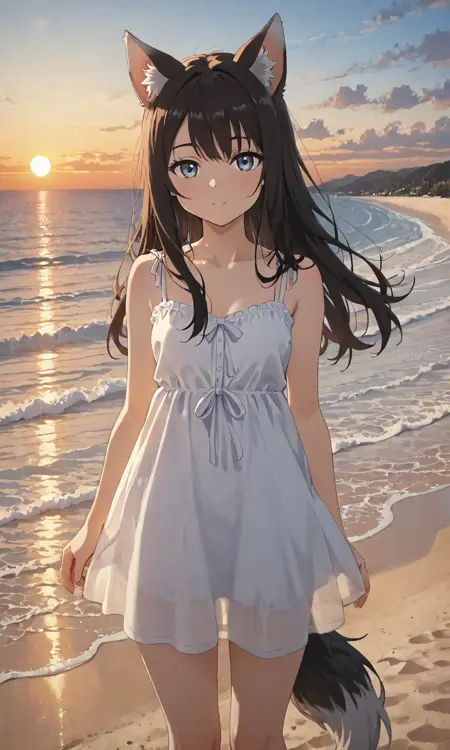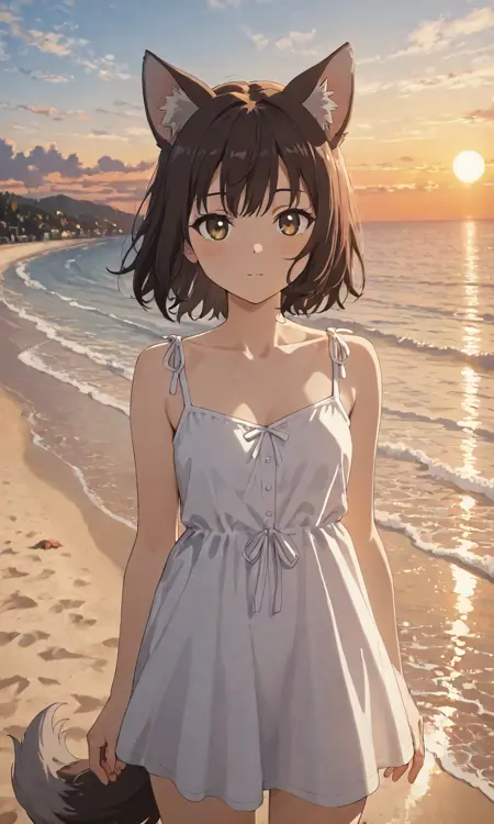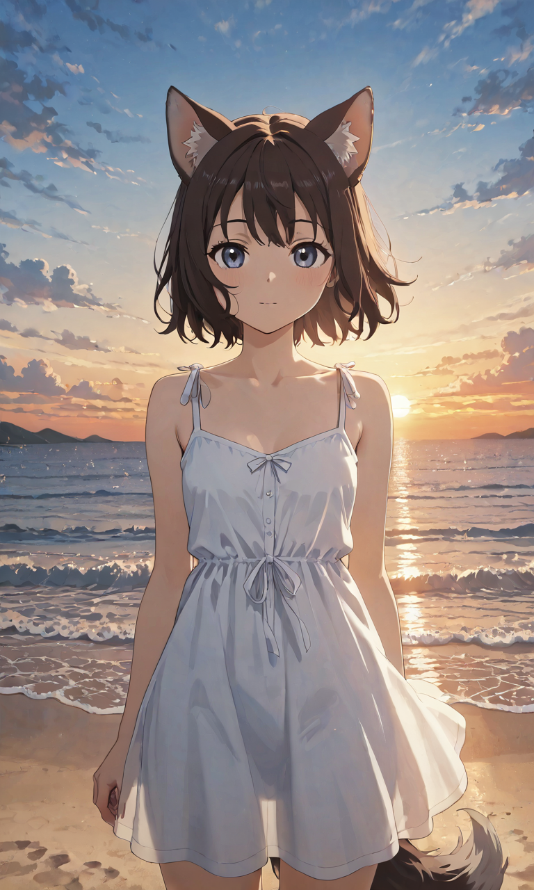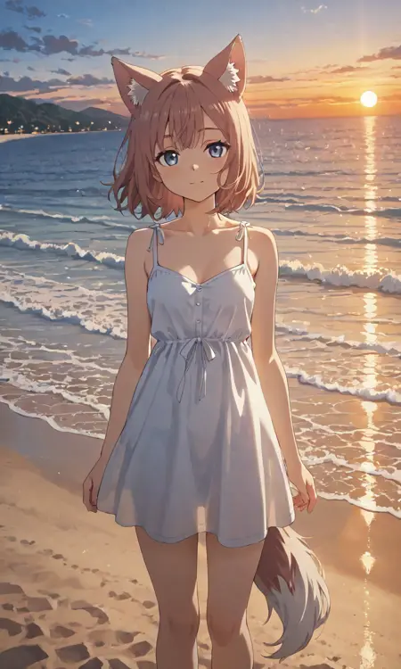 杰作,可爱,甜美,(最佳品质:1.3),非常美学,1个女孩,单人,脸红,(高清眼睛),(高渐变眼睛),(细节丰富的眼睛),(高清晰度眼睛),(中等胸部:1.2),下垂乳房,表情满足,海滩,大海,沙子,日落,(trg_sain),白色连衣裙,夏日连衣裙,夏日帽子