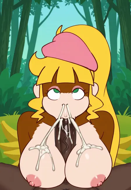 Positive Prompts: DixieM8, furry, anthro, primate, monkey, blonde hair, long ponytail, green eyes, pink eyeshadow, brown body, brown fur, white body, two tone body, tailless, big breasts