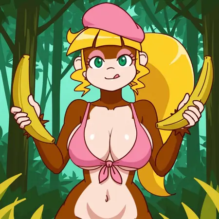 Dixie Kong from Donkey Kong Country 2, but this is the artist Minus8's depiction of the character. All training has been done taking screencaps of Minus8's video animation of the character and removing the watermarks, so they don't appear in the images generated. It might not generate the correct eyelash count all the time, but everything else works great. Also put "eyebrows" in the negative prompts since she doesn't have any (unless you want that) and "cabillou" so there isn't a pointy top sticking out of her beret. Sometimes it might generate her eyebrows regardless of putting it in the negative prompts, so just a heads up on that. Depending on the checkpoints you use it might change her facial design too when it comes to her eyes.