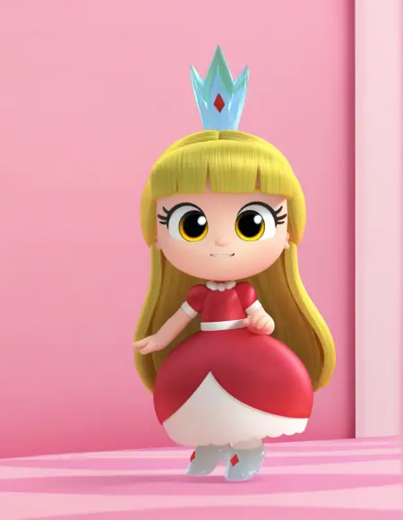 grizelda_tntrk, 1girl, blonde hair, long hair, red dress, crystal crown, puffy short sleeves, pearl necklace, yellow eyes, high heels